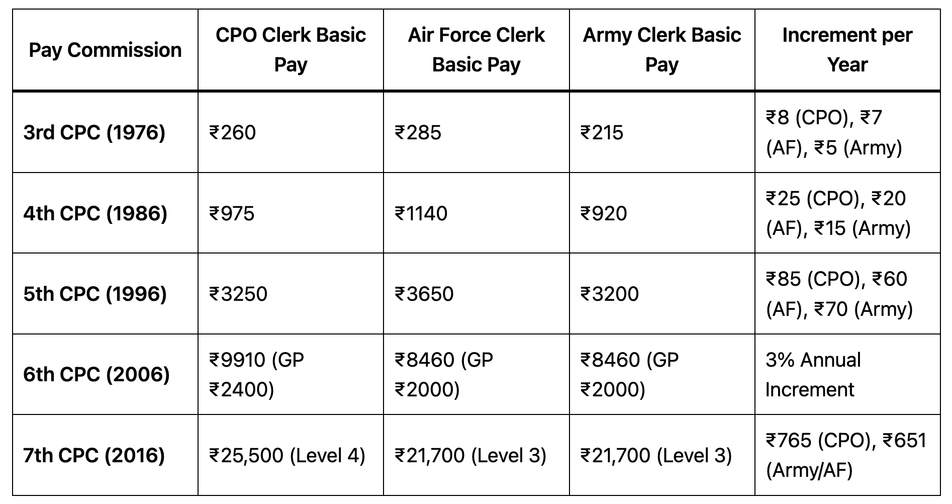 ЁЯТ░ рднрд╛рд░рддреАрдп Armed Forces Clerks рдФрд░ Paramilitary Clerks рдХреЗ рд╡реЗрддрди рд╕рдВрд░рдЪрдирд╛ рдореЗрдВ рдкрд┐рдЫрд▓реЗ 50 рд╕рд╛рд▓реЛрдВ рд╕реЗ рдмрдбрд╝рд╛ рдЕрд╕рдорд╛рдирддрд╛ рдмрдиреА рд╣реБрдИ рд╣реИред рдХреЛрд░реНрдЯ рдХреЗрд╕ рдлрд╛рдЗрдирд▓ рд╣реЗрд░рд┐рдВрдЧ 22 May 2025. ЁЯУК 8th Pay Commission рдХреА рддреИрдпрд╛рд░реА рдХреЗ рдмреАрдЪ 3rd Pay Commission (1976) рдХрд╛ рдЬрд┐рдХреНрд░ рдХреНрдпреЛрдВ рд╣реЛ рд░рд╣рд╛ рд╣реИ? рдЗрд╕рдХрд╛ рдЬрд╡рд╛рдм Pay Structure рдХреЗ рдРрддрд┐рд╣рд╛рд╕рд┐рдХ рдмрджрд▓рд╛рд╡ рдореЗрдВ рдЫрд┐рдкрд╛ рд╣реИред рдЖрдЗрдП рдЗрд╕реЗ рд╡рд┐рд╕реНрддрд╛рд░ рд╕реЗ рд╕рдордЭрддреЗ рд╣реИрдВредЁЯУК Pay Evolution in Different Pay Commissions (1976-2024)ЁЯУЬ 3rd Pay Commission (1976) тАУ рдЕрд╕рдорд╛рдирддрд╛ рдХреА рд╢реБрд░реБрдЖрддЁЯФН рдЗрд╕ рдЖрдпреЛрдЧ рдиреЗ Armed Forces рдФрд░ Paramilitary Forces рдХреЗ Clerks рдХреЗ рдмреАрдЪ Pay Disparity рдХреА рдиреАрдВрд╡ рд░рдЦреАредCPO Clerk рдХрд╛ Basic Pay тВ╣260 рддрдп рдХрд┐рдпрд╛ рдЧрдпрд╛ рдФрд░ Annual Increment тВ╣8 рд░рдЦрд╛ рдЧрдпрд╛редAir Force Clerk рдХреЛ тВ╣285 Basic Pay рдорд┐рд▓рд╛, рд▓реЗрдХрд┐рди Increment тВ╣7 рд░рдЦрд╛ рдЧрдпрд╛ (рд╣рд░ рд╕рд╛рд▓ тВ╣1 рдХрдо рдмрдврд╝рдд)редArmy Clerk рдХреЛ рдорд╛рддреНрд░ тВ╣215 Basic Pay рдФрд░ тВ╣5 Increment рджрд┐рдпрд╛ рдЧрдпрд╛ (рд╣рд░ рд╕рд╛рд▓ тВ╣3 рдХрдо рдмрдврд╝рдд)редЁЯУЙ рдпрд╣рд╛рдБ рд╕реЗ рд╣реА Armed Forces Clerks рдХрд╛ рд╡реЗрддрди CPO Clerks рд╕реЗ рдХрдо рд░рд╣рдирд╛ рд╢реБрд░реВ рд╣реБрдЖред ЁЯУЬ 4th Pay Commission (1986) тАУ Gap рдФрд░ рдмрдврд╝рд╛ЁЯТ░ Basic Pay Structure (Clerk Cadre) рдореЗрдВ рдЕрдВрддрд░ рдФрд░ рдмрдврд╝ рдЧрдпрд╛:CPO Clerk рдХреЛ тВ╣975 Basic Pay рдФрд░ тВ╣25 Increment рдорд┐рд▓рд╛редAir Force Clerk рдХреЛ тВ╣1140 Basic Pay, рд▓реЗрдХрд┐рди Increment тВ╣20 рд░рдЦрд╛ рдЧрдпрд╛ (рд╣рд░ рд╕рд╛рд▓ тВ╣5 рдХрдо рдмрдврд╝рдд)редArmy Clerk рдХреЛ рдорд╛рддреНрд░ тВ╣920 Basic Pay рдФрд░ тВ╣15 Increment рджрд┐рдпрд╛ рдЧрдпрд╛ (рд╣рд░ рд╕рд╛рд▓ тВ╣10 рдХрдо рдмрдврд╝рдд)редтЪЦя╕П рдЗрд╕рдХрд╛ рдЕрд╕рд░:Army Clerk рдкрд╣рд▓реЗ рд╕реЗ рд╣реА рдХрдо рд╡реЗрддрди рдкрд╛ рд░рд╣реЗ рдереЗ, рдФрд░ рд╣рд░ рд╕рд╛рд▓ Pay Disparity рдмрдврд╝рддреА рдЧрдИредCPO Clerks рдХреЗ рдореБрдХрд╛рдмрд▓реЗ Air Force Clerks рдХреЛ рд╣рд░ рд╕рд╛рд▓ тВ╣5 рдФрд░ Army Clerks рдХреЛ тВ╣10 рдХрдо рдорд┐рд▓ рд░рд╣рд╛ рдерд╛редЁЯУЬ 5th Pay Commission (1996) тАУ “Trade Rationalization” рдХрд╛ рдкреНрд░рд╕реНрддрд╛рд╡тЪЦя╕П рдЗрд╕ рдЖрдпреЛрдЧ рдиреЗ рдорд╛рдирд╛ рдХрд┐ Armed Forces Clerks рдХрд╛ рд╡реЗрддрди CPO Clerks рдХреЗ рдмрд░рд╛рдмрд░ рд╣реЛрдирд╛ рдЪрд╛рд╣рд┐рдПредЁЯТб “Trade Rationalization” рдХрд╛ рдкреНрд░рд╕реНрддрд╛рд╡ рджрд┐рдпрд╛ рдЧрдпрд╛:X Group тАУ Diploma Holders рдХреЛ Higher Pay Band рджрд┐рдпрд╛ рдЬрд╛рдПредY Group тАУ Clerical рдФрд░ Non-Technical Trades рдХреЛ Standard Pay рджрд┐рдпрд╛ рдЬрд╛рдПредЁЯУЙ рд▓реЗрдХрд┐рди Armed Forces Clerks рдХреЛ рдлрд┐рд░ рднреА рдиреБрдХрд╕рд╛рди рд╣реБрдЖ:CPO Clerk рдХреЛ тВ╣3250 Basic Pay рдФрд░ тВ╣85 Increment рдорд┐рд▓рд╛редAir Force Clerk рдХреЛ тВ╣3650 Basic Pay, рд▓реЗрдХрд┐рди тВ╣60 Increment рд░рдЦрд╛ рдЧрдпрд╛ (тВ╣25 рдХрдо)редArmy Clerk рдХреЛ рд╕рд┐рд░реНрдл тВ╣3200 Basic Pay рдФрд░ тВ╣70 Increment рдорд┐рд▓рд╛редЁЯЫС рдХреБрд▓ рдорд┐рд▓рд╛рдХрд░, Pay Disparity рдШрдЯрд╛рдиреЗ рдХреА рдХреЛрд╢рд┐рд╢ рдХреА рдЧрдИ рд▓реЗрдХрд┐рди рдкреВрд░реА рддрд░рд╣ рд╕рдлрд▓ рдирд╣реАрдВ рд╣реБрдИредЁЯУЬ 6th Pay Commission (2006) тАУ Pay Grade рдХрд╛ рдЦреЗрд▓ЁЯУМ Pay Commission рдиреЗ Armed Forces Clerks рдХреЛ рдлрд┐рд░ рд╕реЗ рд